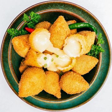 Brazilian cheese balls reimagined for Sin City. Crispy golden spheres filled with stretchy mozzarella that pulls with every bite. Coated in glittery panko and served hot with spicy jalapeño-ranch for dipping. Bold and indulgent.